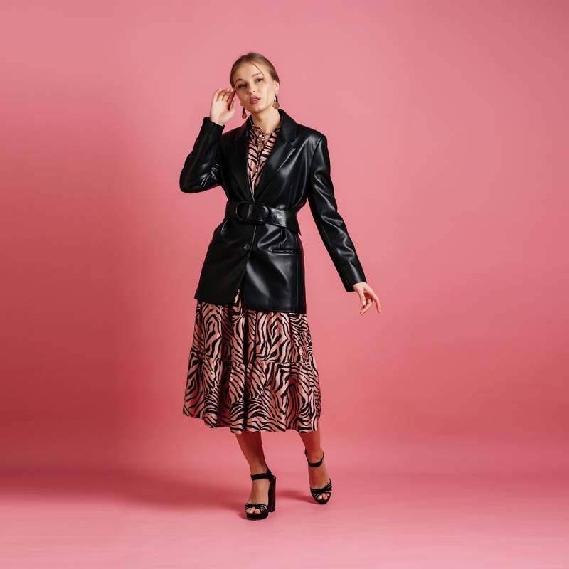 Pink printed women A-line dress, has a round neck, three-quarter sleeves, an attached lining, and flared hem